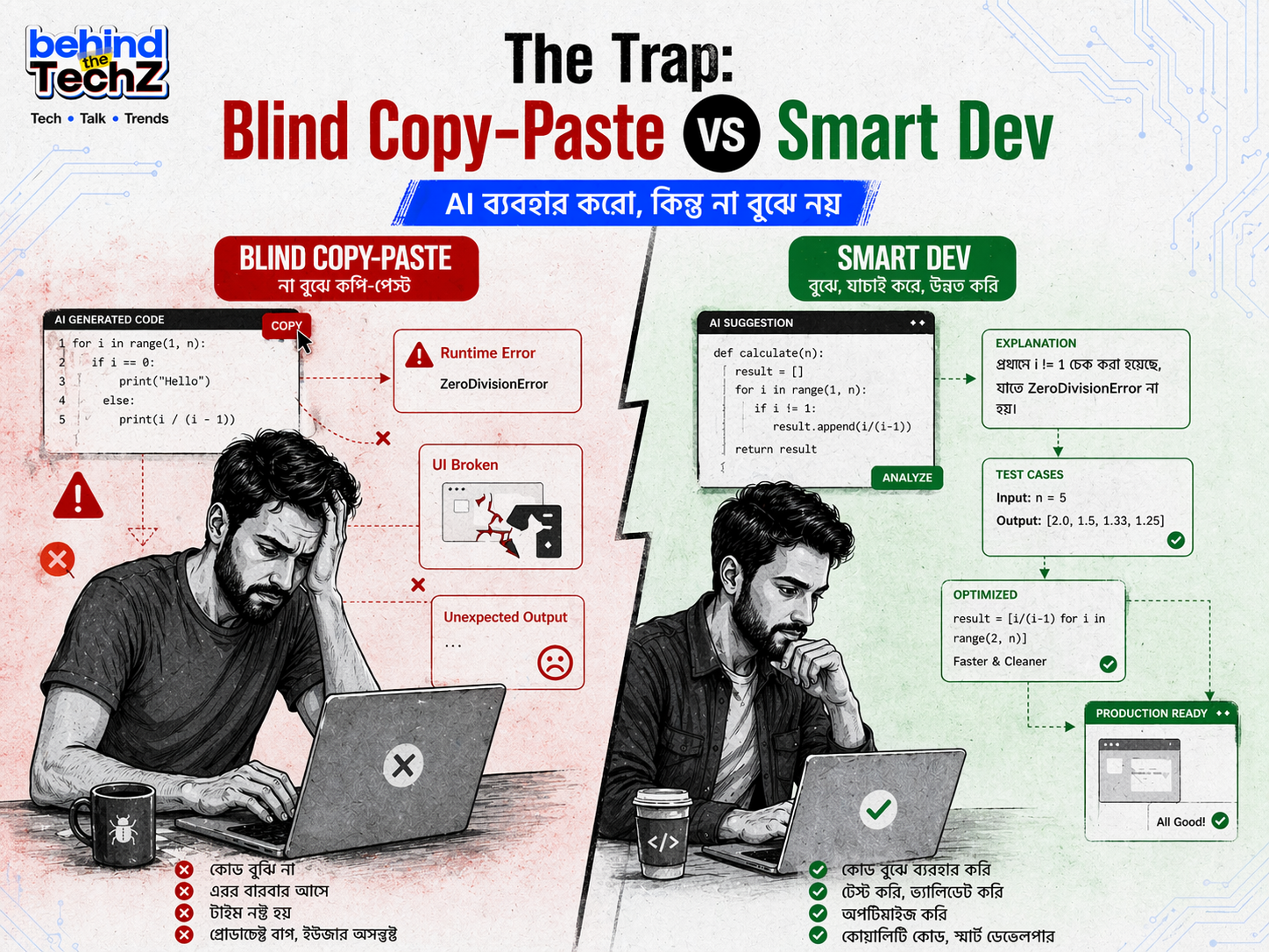 Cursor Editor বা Claude Code ব্যবহার করে আপনি ফিচারের ৬০–৮০% কোড সরাসরি AI দিয়ে লিখিয়ে নিতে পারেন। কিন্তু এখানে একটা বড় ফাঁদ আছে—অনেক ডেভেলপার AI-এর দেওয়া কোড না বুঝেই কপি-পেস্ট করেন। এটা স্বল্পমেয়াদে কাজ করলেও দীর্ঘমেয়াদে বিপজ্জনক।